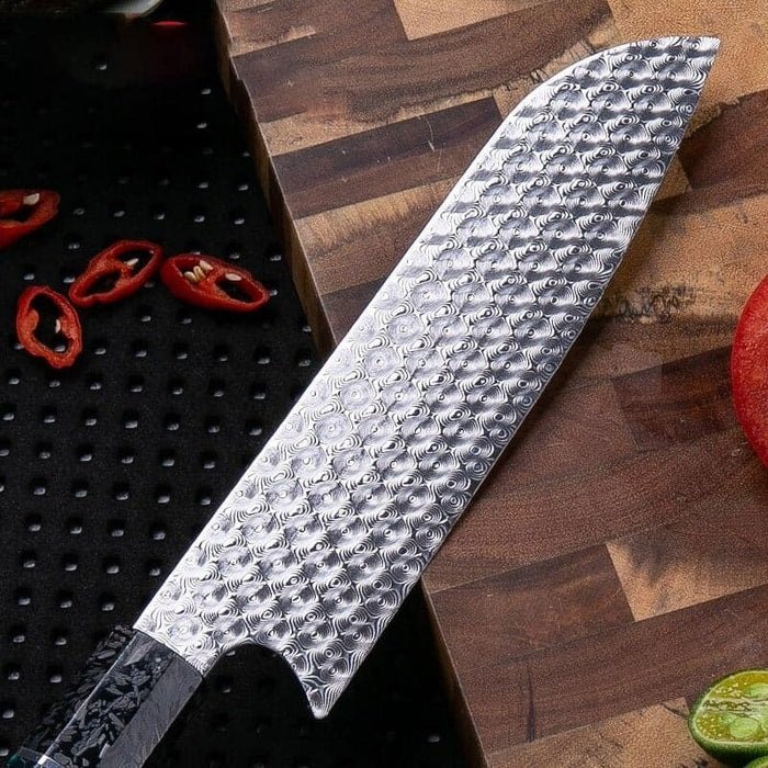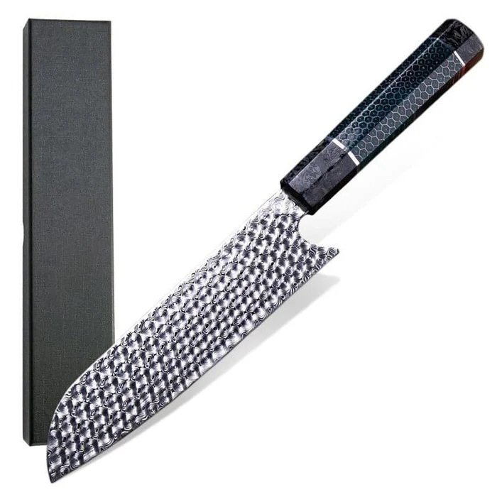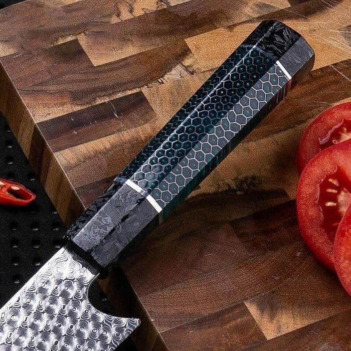 ESPECIFICAÇÕES:  Material da Lâmina: Aço Damasco VG10 Dureza da Lâmina: HRC 58-60 Material do Cabo: Tinta Fluorescente, Fibra de Carbono e Resinado Comprimento Total: 29 cm Comprimento da Lâmina: 16 cm Espessura da Lâmina: 2,3 mm Peso: 144g