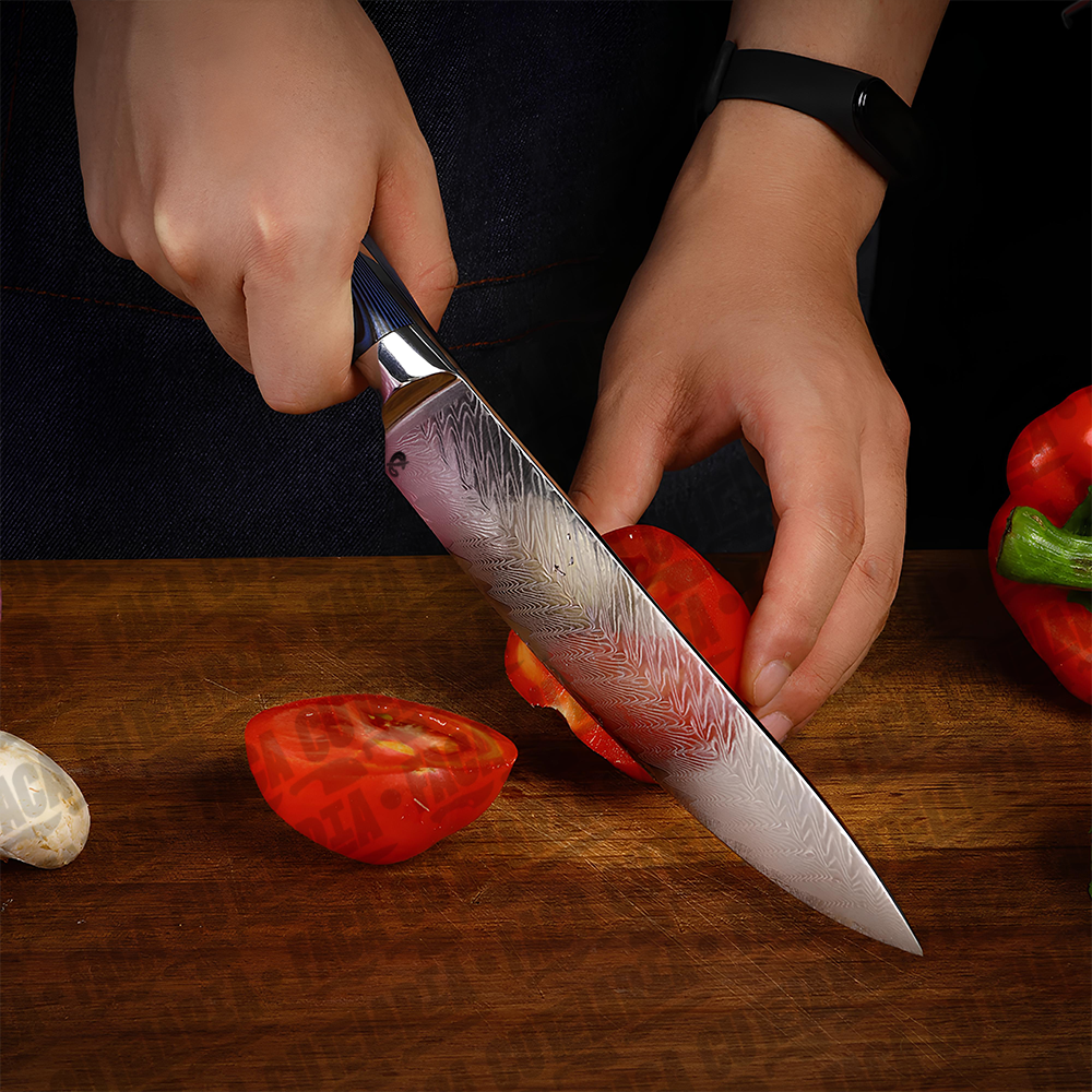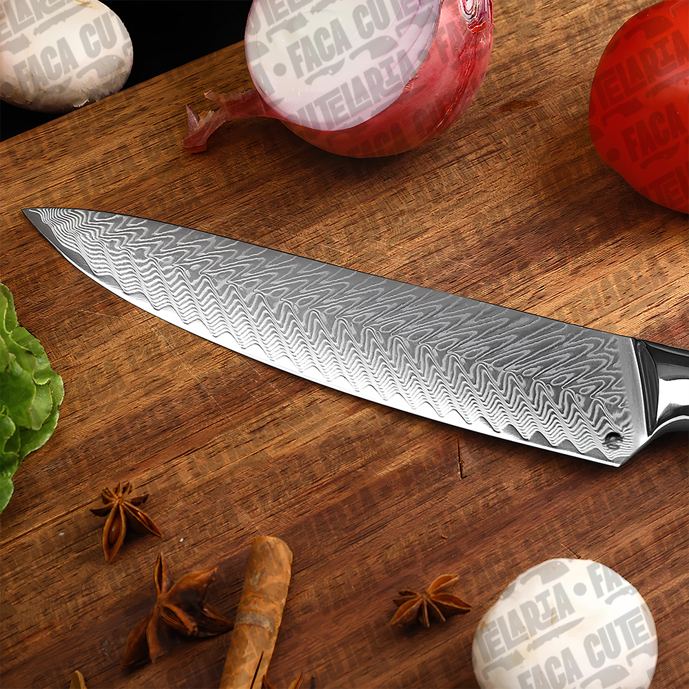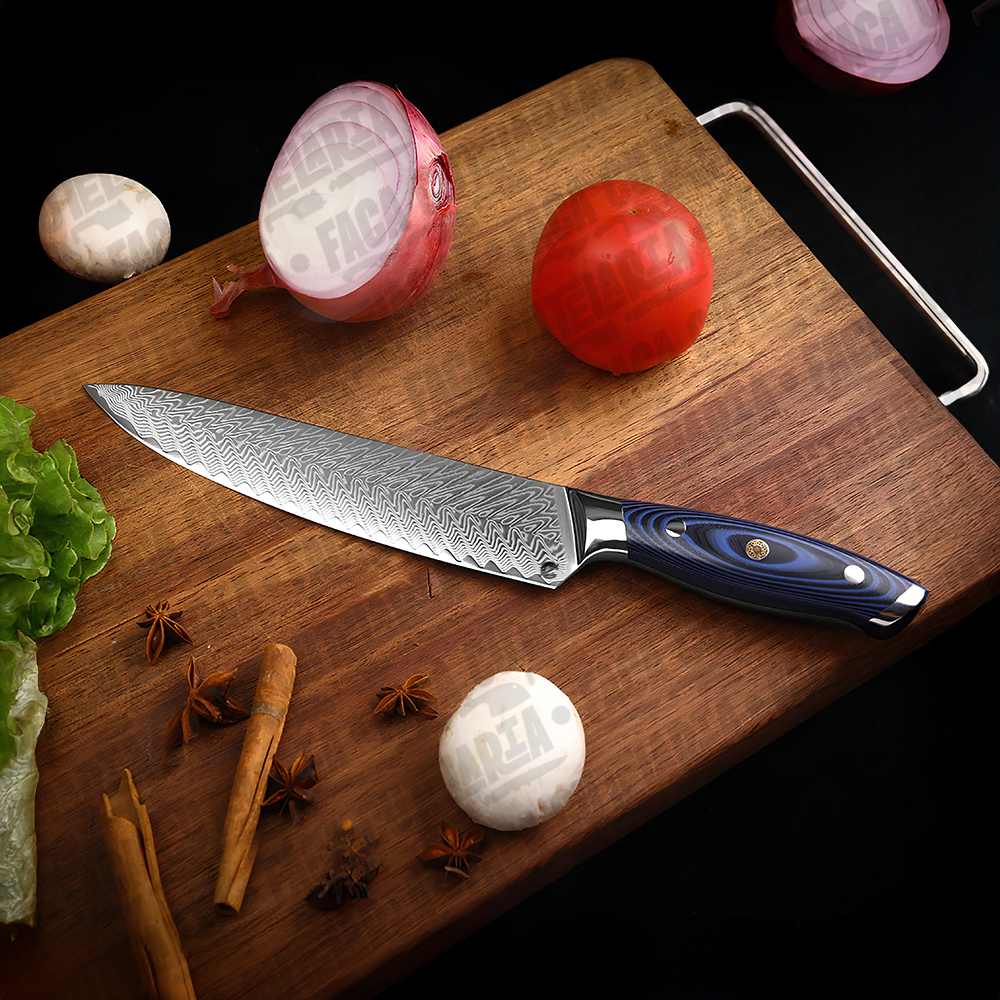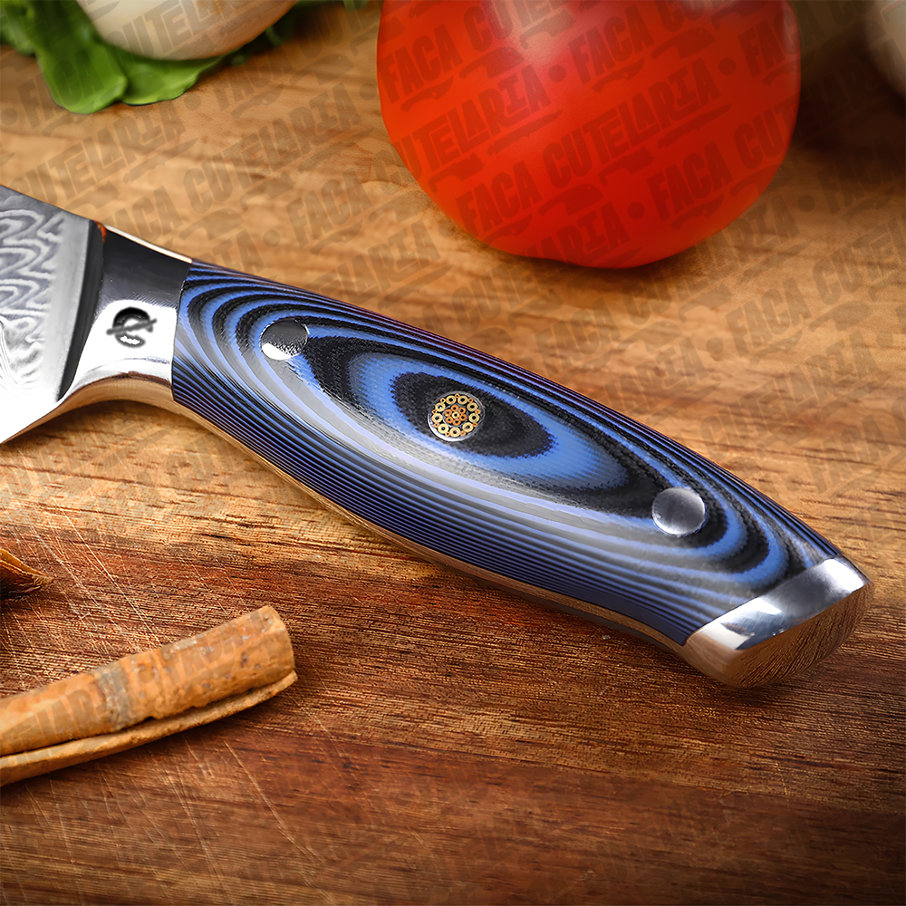 ESPECIFICAÇÕES: Comprimento total: 32,7 cm Comprimento da lâmina: 20,5 cm (8 polegadas) Largura da lâmina: 4 cm (na parte mais larga) Espessura da lâmina: 2 mm Peso líquido: 254g. Dureza: 60 HRC. Material da Lâmina: Aço Damasco 67 Camadas Cabo: Combinação de resina azul e madeira. Características: Afiada e durável; anti ferrugem Material do Damasco VG10: Aço 10cr15. Nível de corte: O nível de força de corte: 6.0-8.0 N.Navalha muito afiada Bônus: Bainha